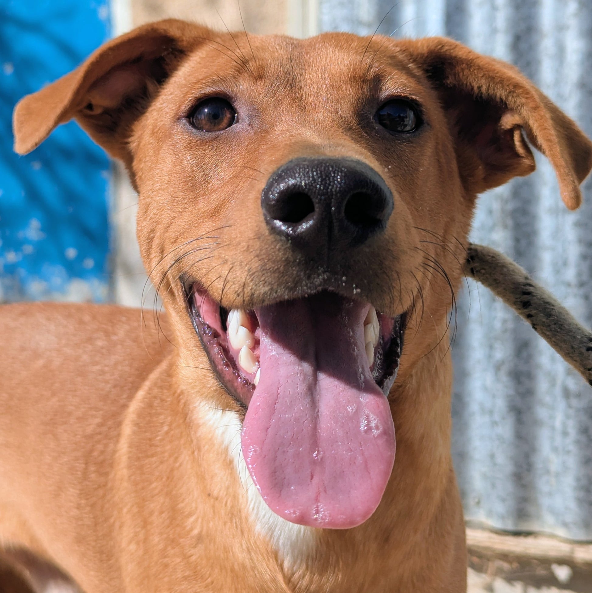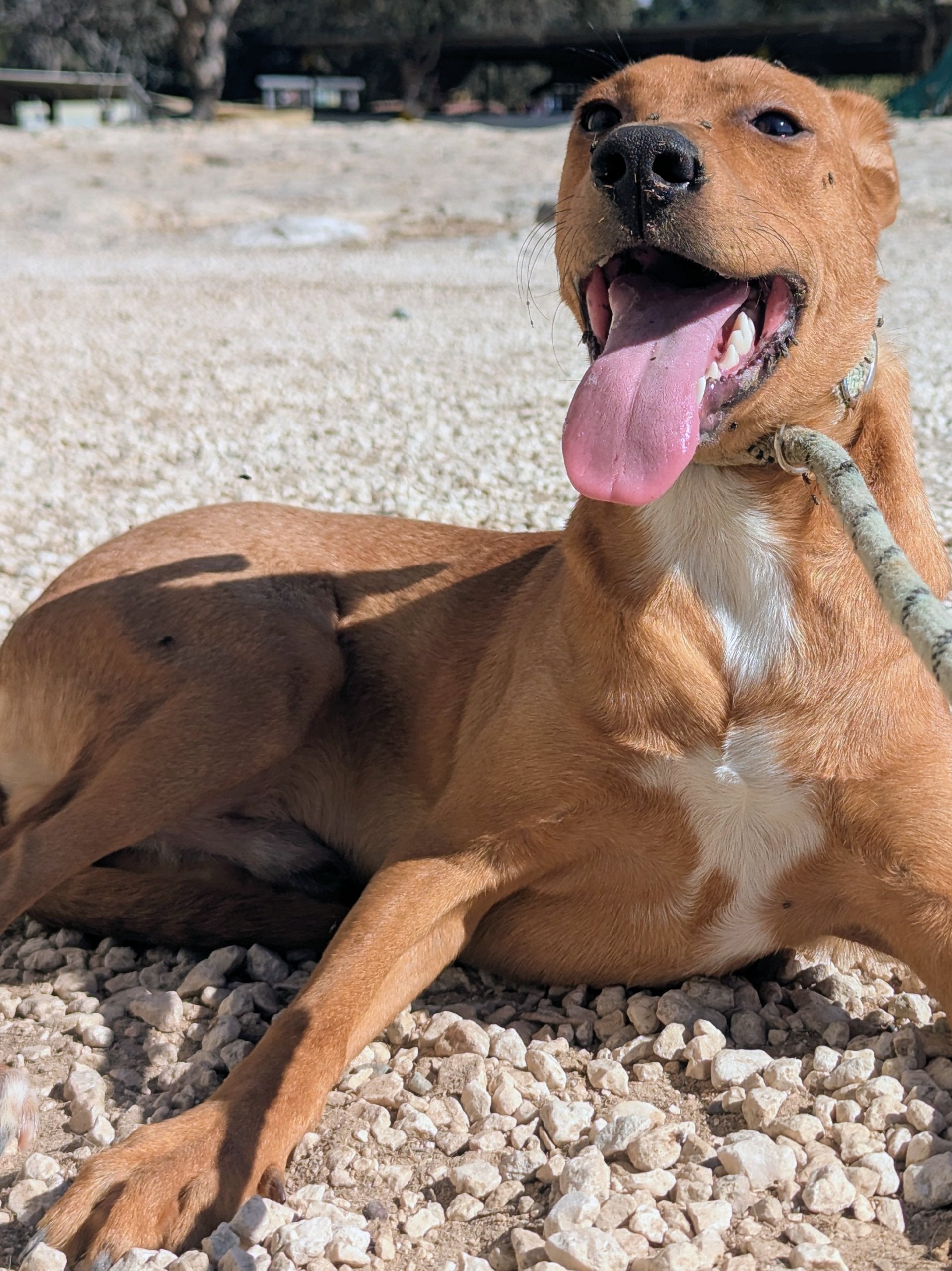 Medium-sized young mixed breed male, tan with white patches on his chest and neck. Very timid