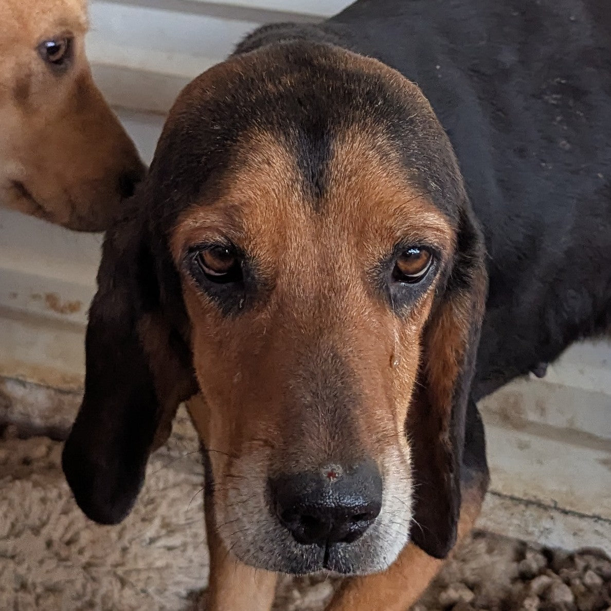 Метис швейцарской гончей, черная с подпалом, около 5 лет. С людьми осторожно контактная, человекоориентированна. К собакам нейтральна. Приучена к поводку. Куратор Светлана