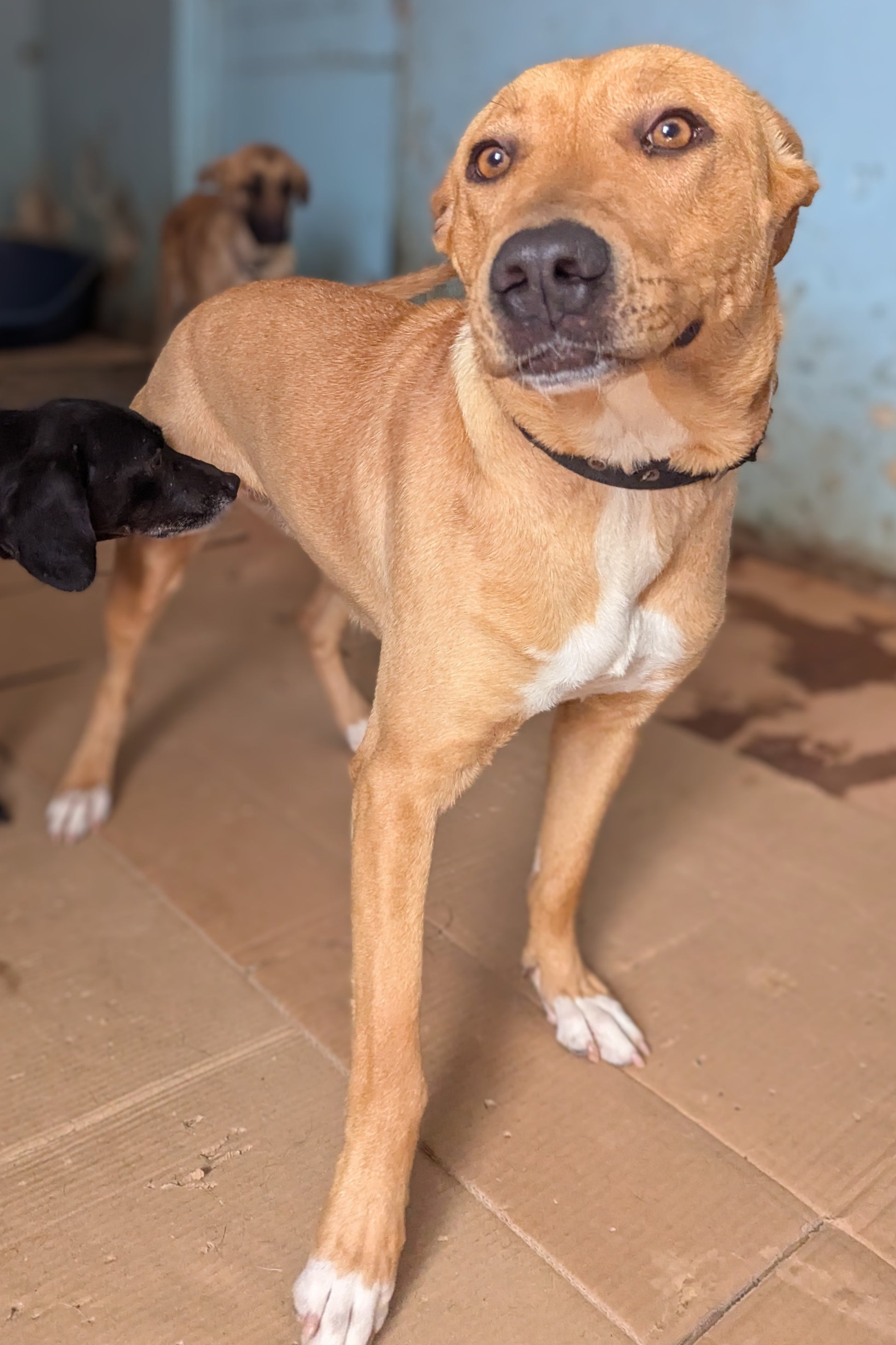 Среднего к крупному размера девочка золотистого окраса с белым пятном на груди и пальцах всех лап
