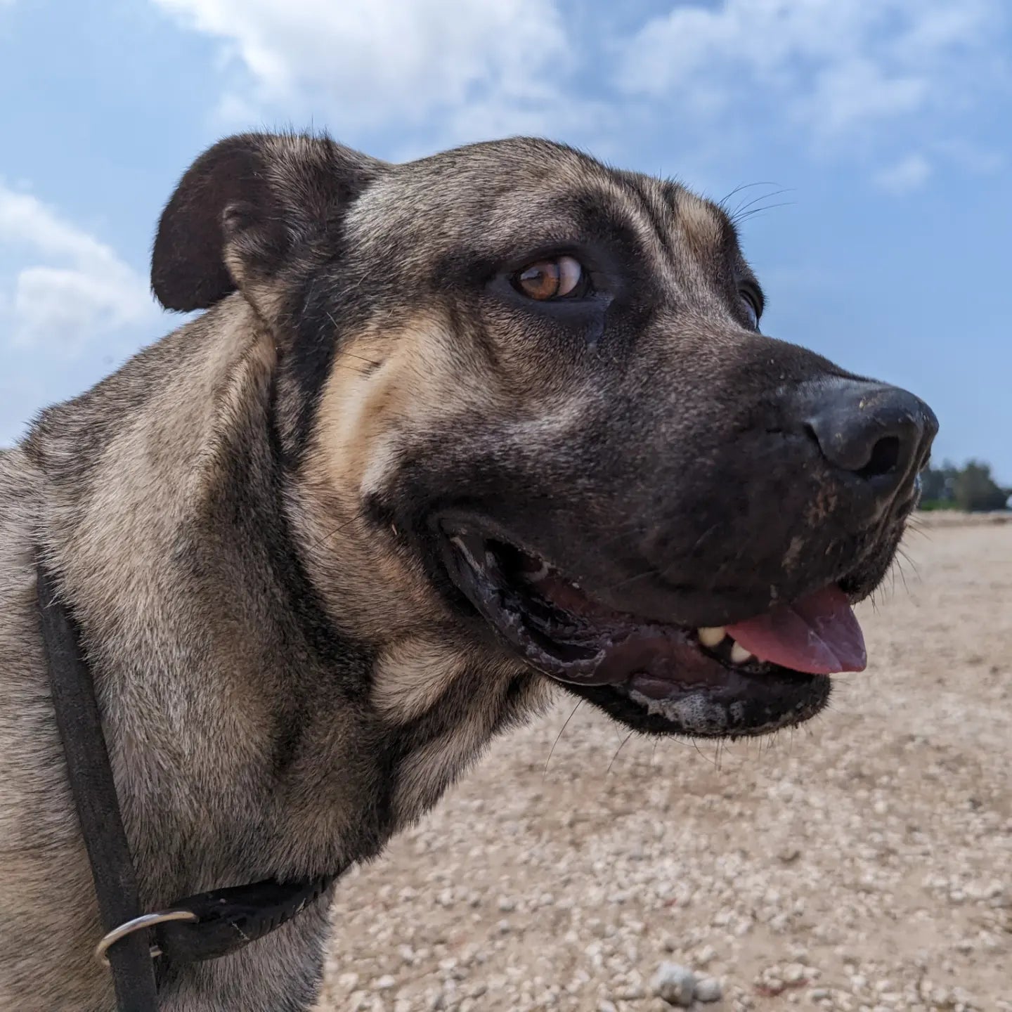 Очень крупный метис, молодой, окрас серый. С людьми дружелюбен, немного пуглив к новым людям и крикам