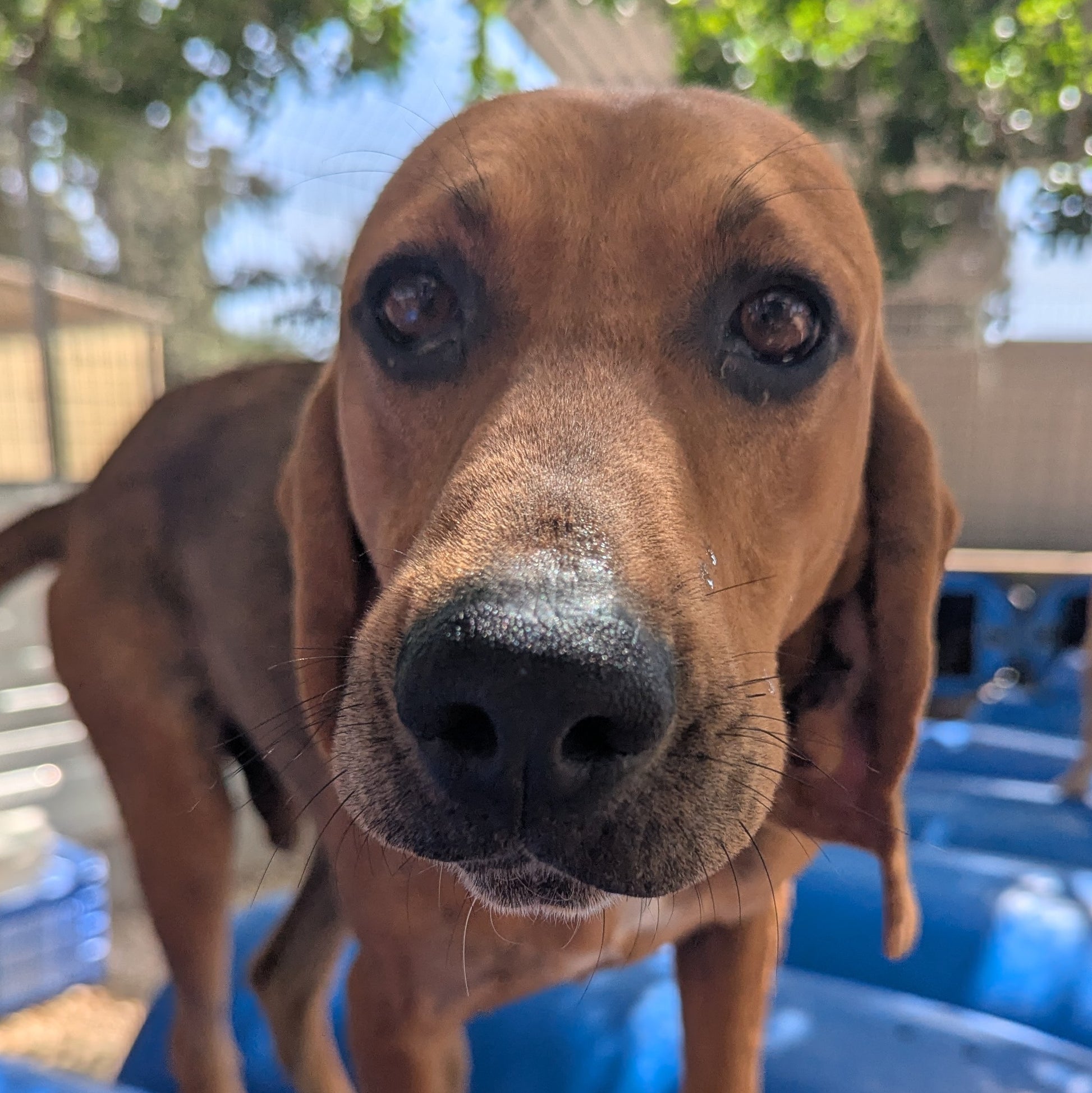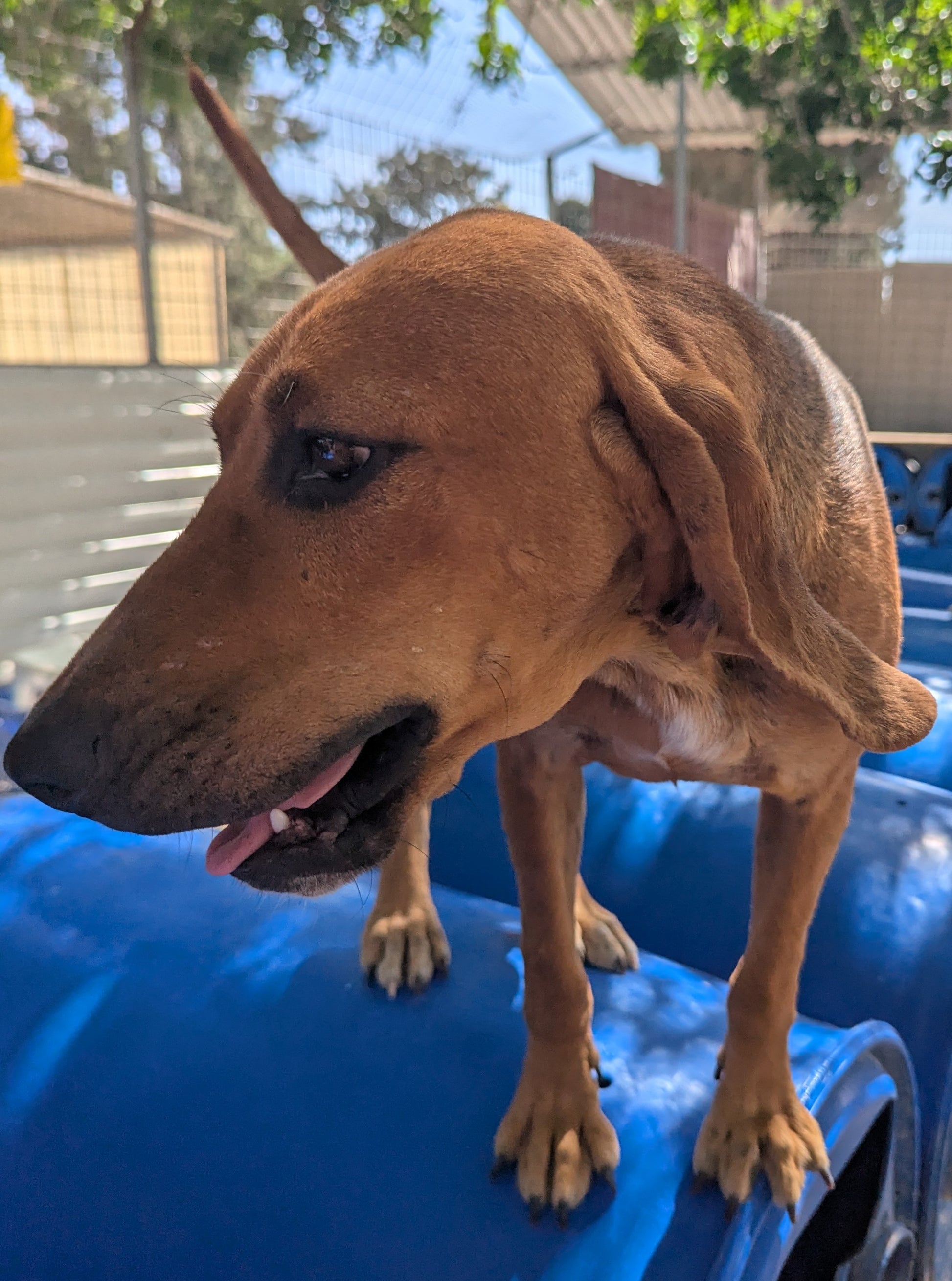 Среднего размера мальчик охотничей породы рыжего окраса с черным подпалом на спине, небольшим белым пятном на груди и белыми пятнами на задних ногах