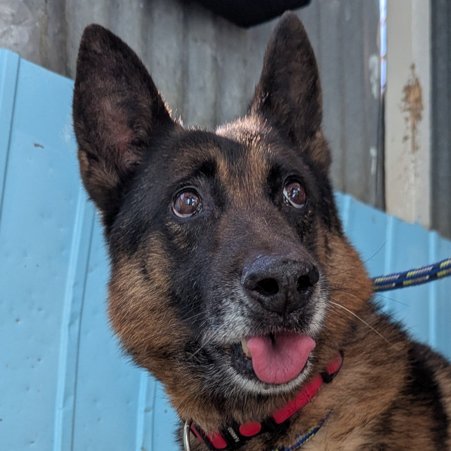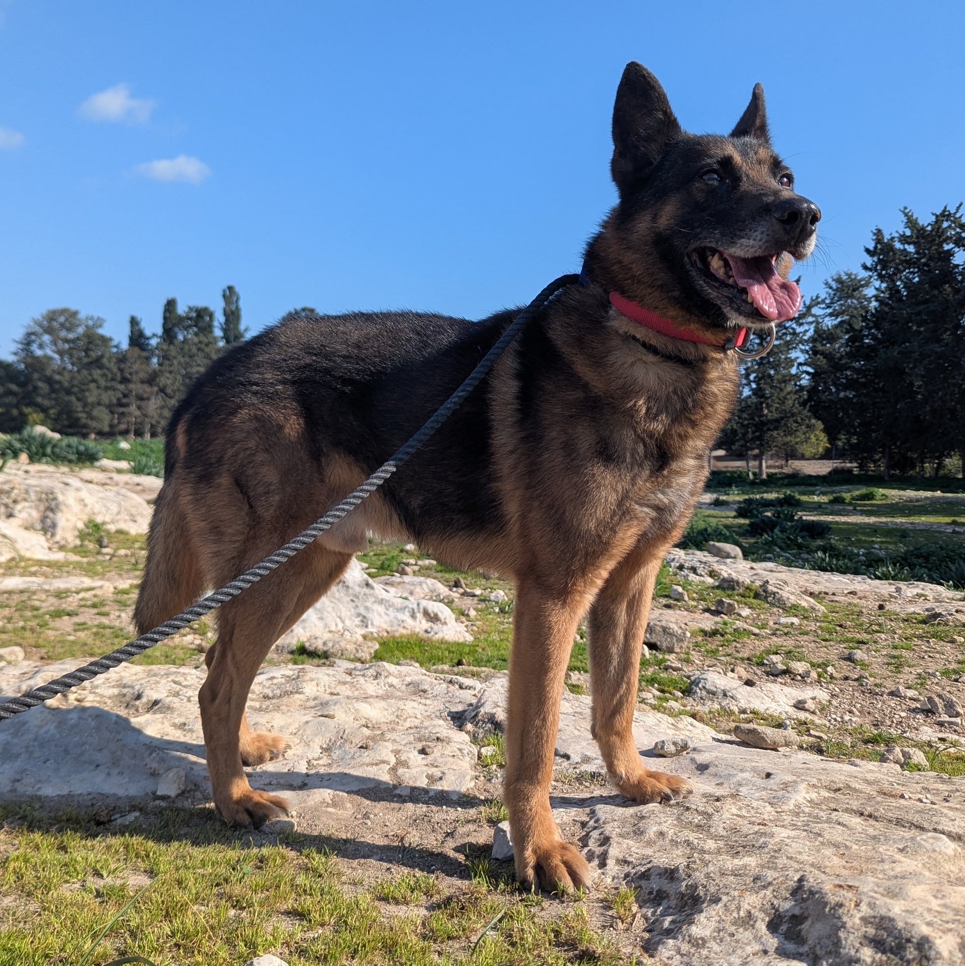 Кобель немецкой овчарки среднего или старшего. На прогулке относительно спокоен, практически не тянет