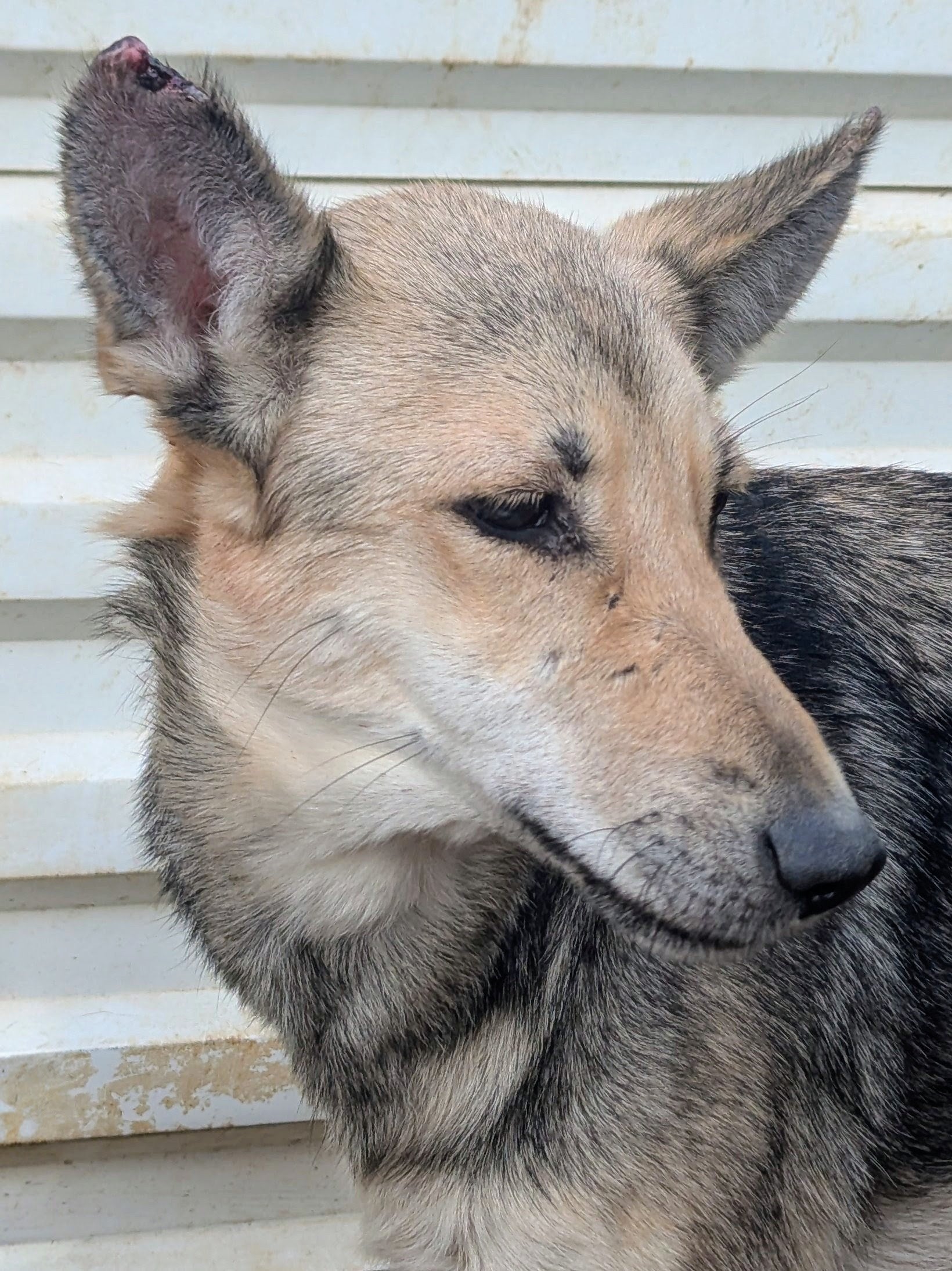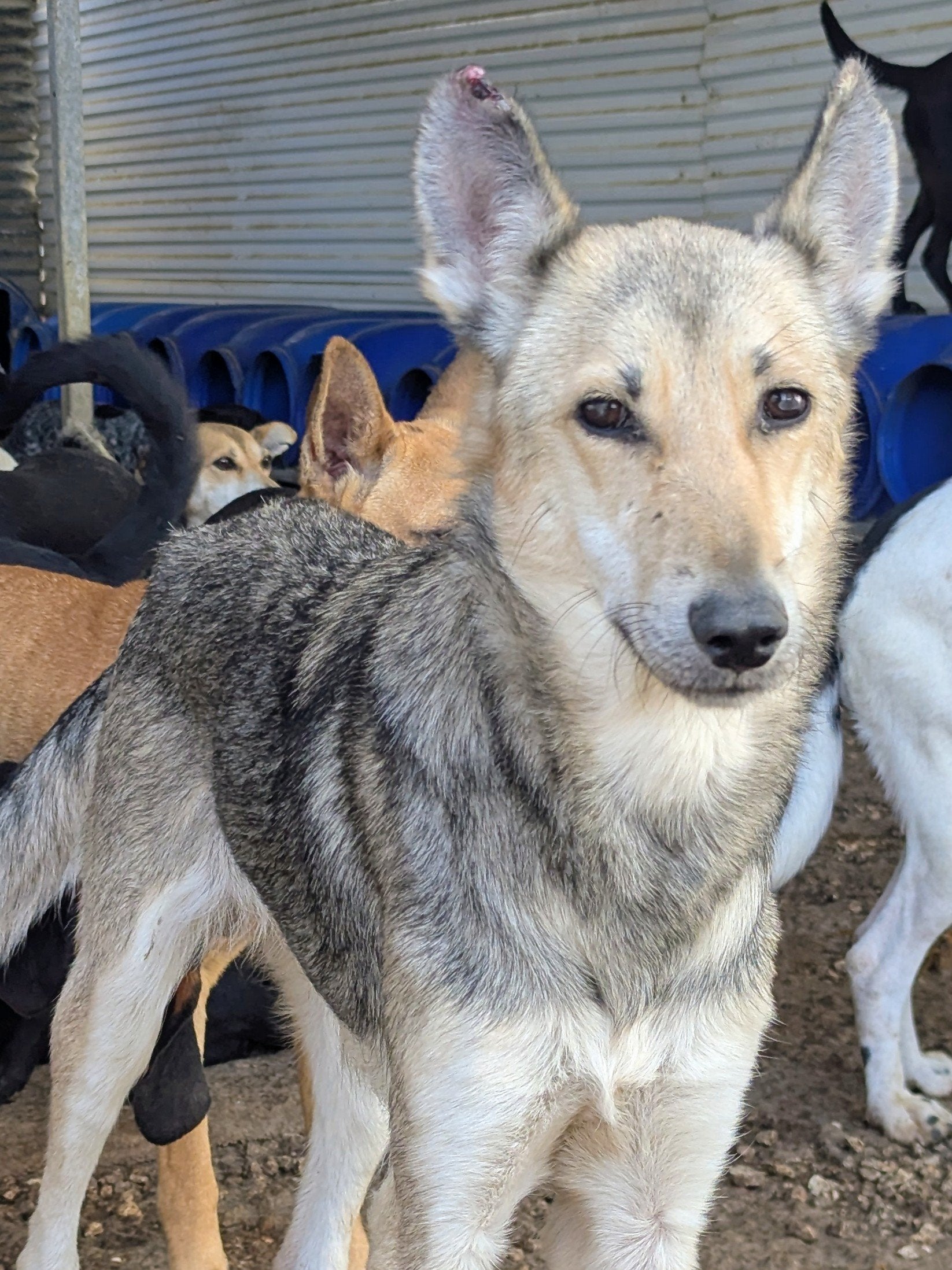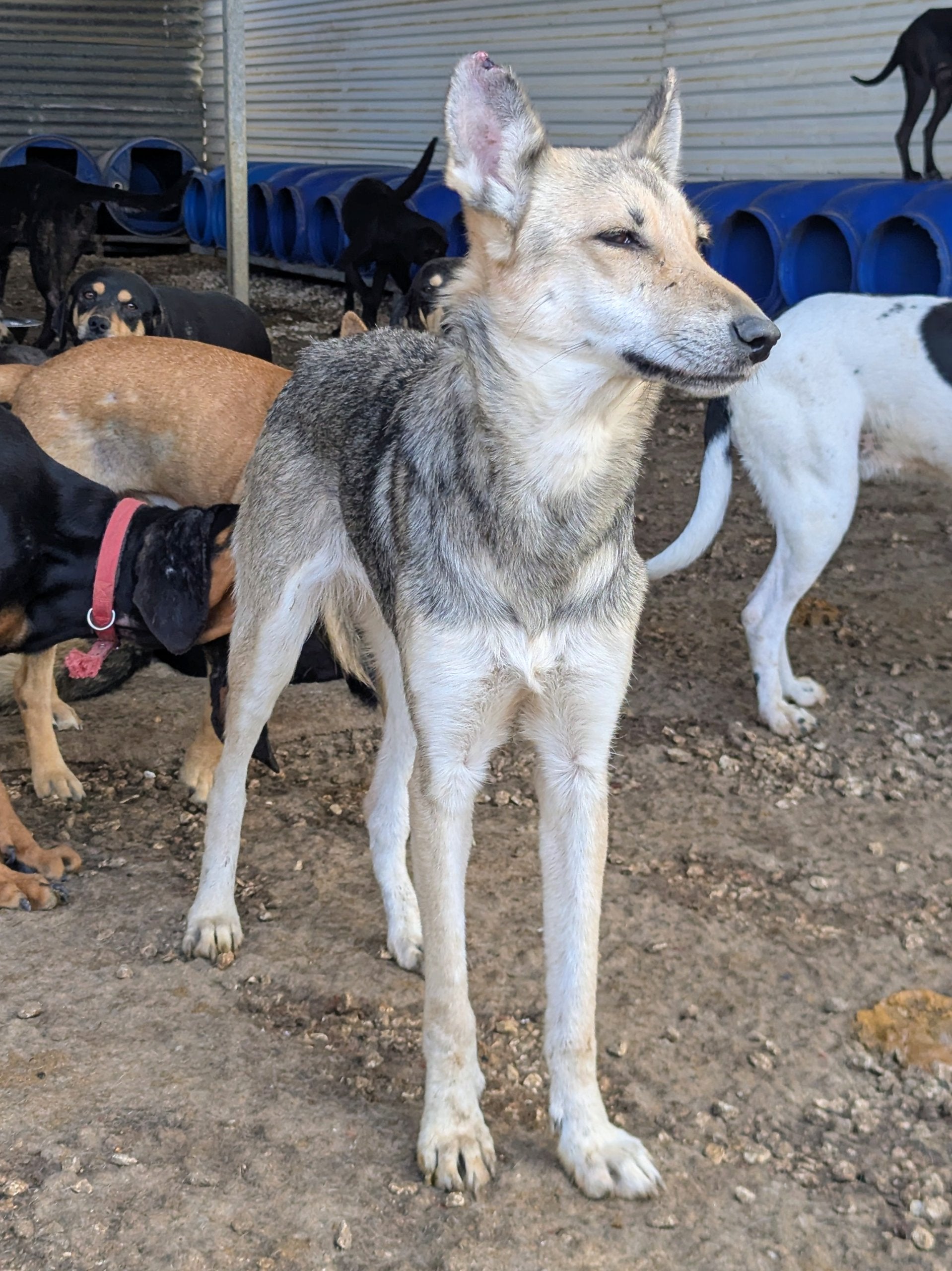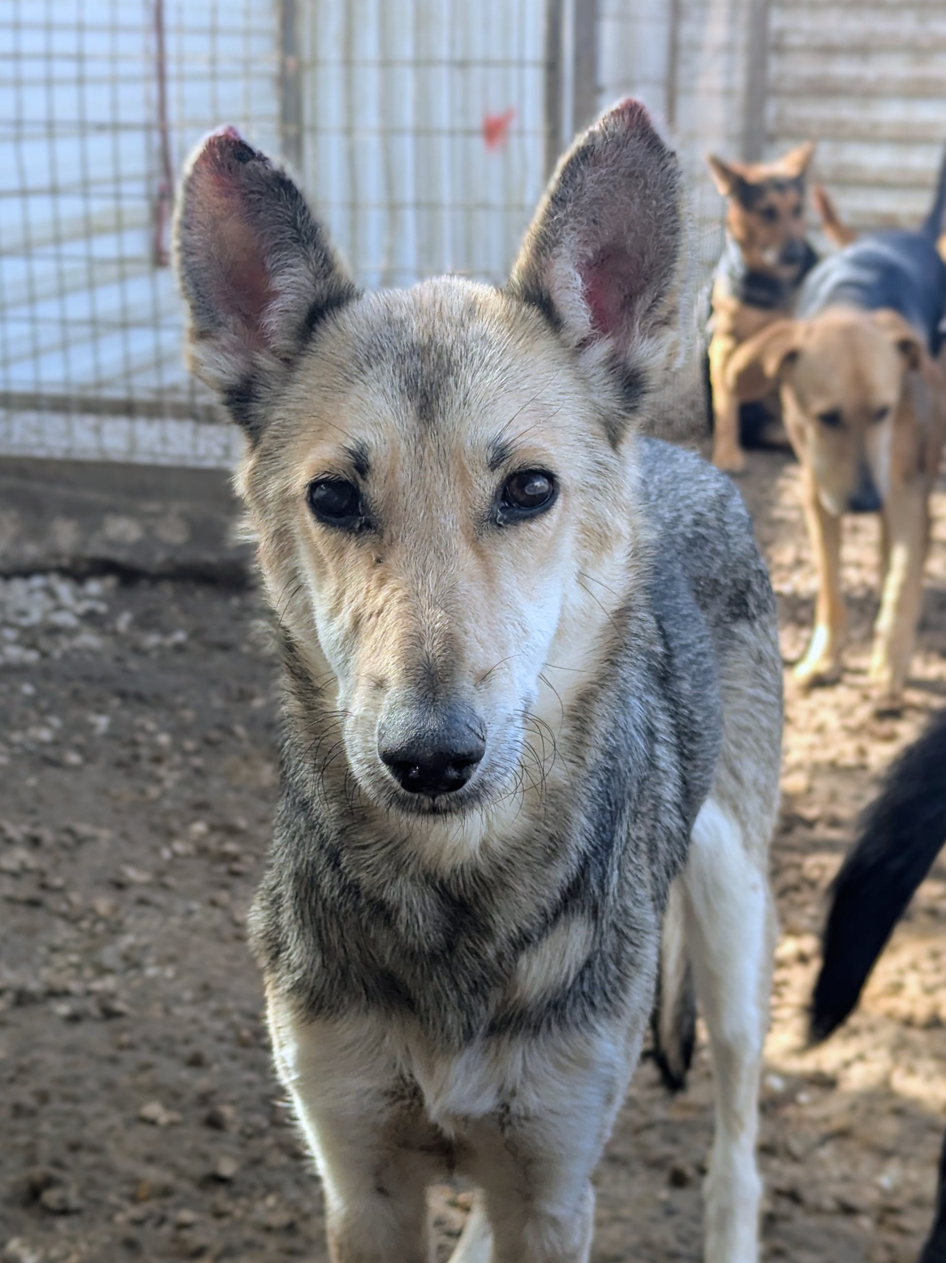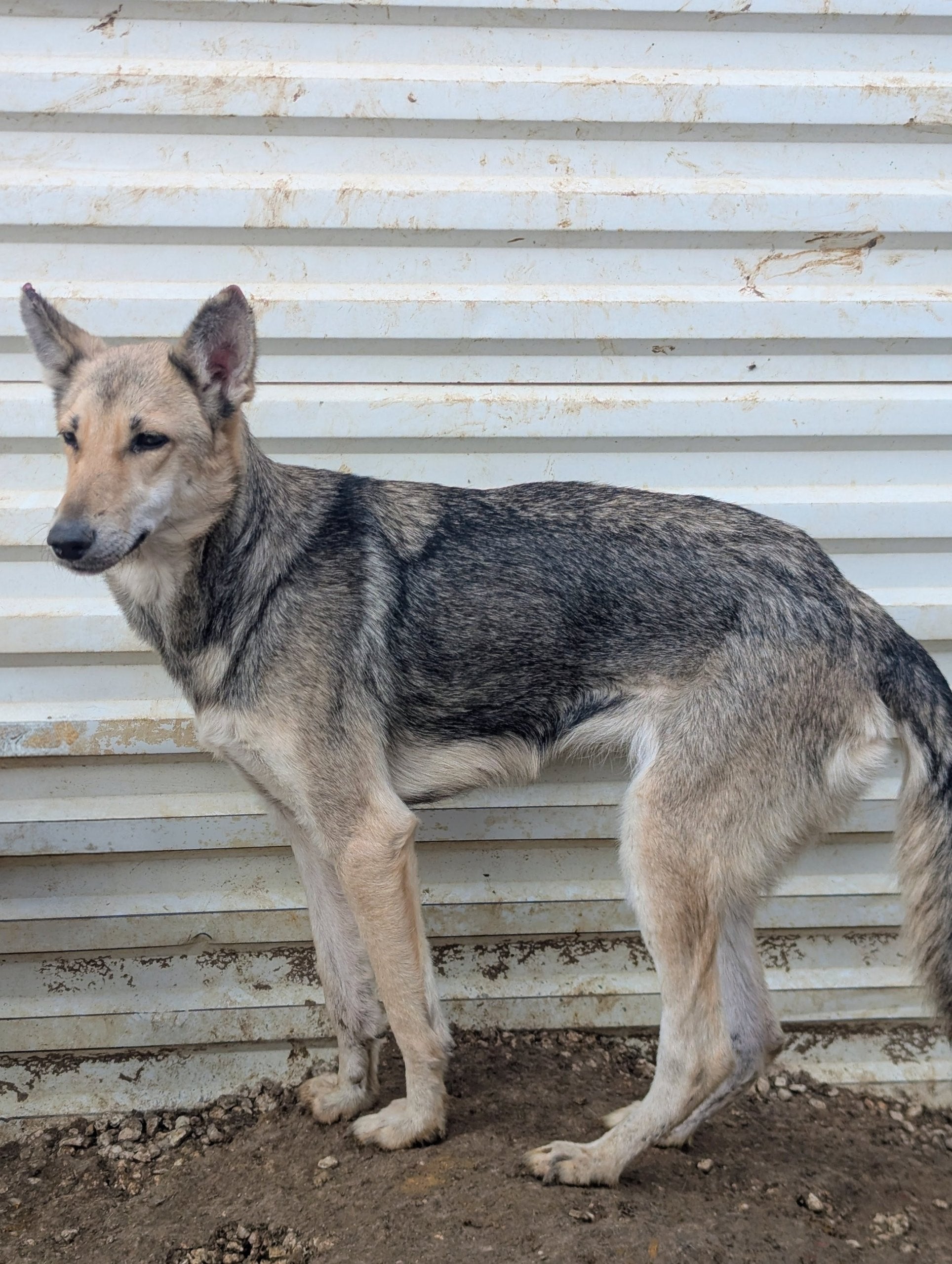 Medium-sized shepherd cross female with gray coat. Slim, tall, and elegant. Looks like a coyote