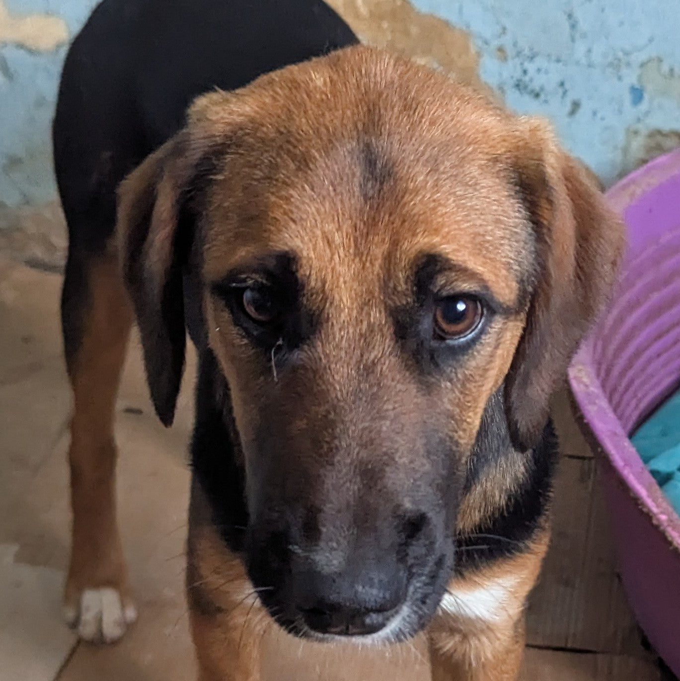 Среднего размера пёс, окрас черный с коричневым и белыми пятнами на груди и лапах. Издалека как будто носит очки