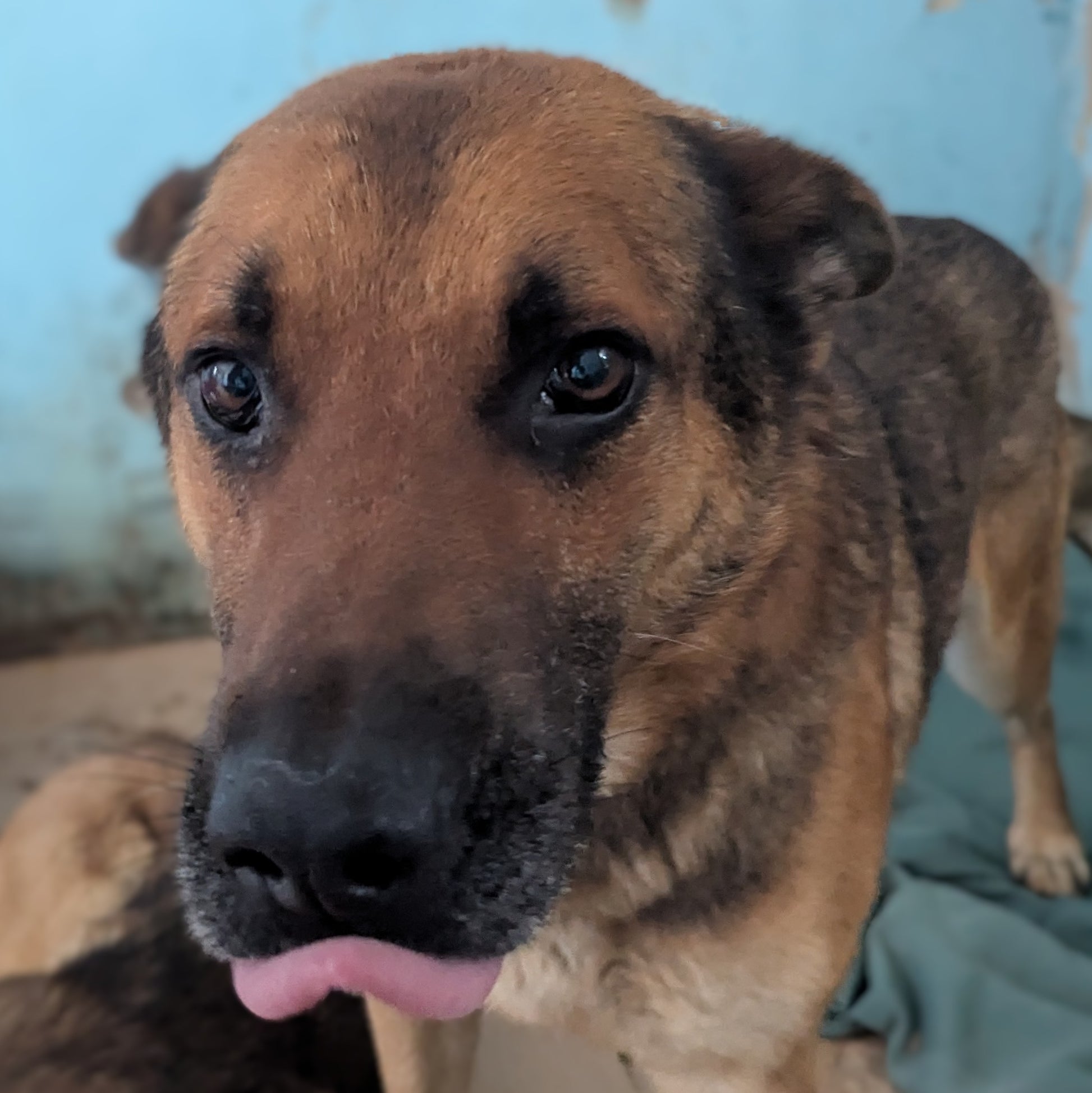 Крупный мальчик метис немецкой овчарки. Окрас коричневый с черным. Очень запуганный, гулять на поводке боится. В вольере демонстрирует доминантное поведение