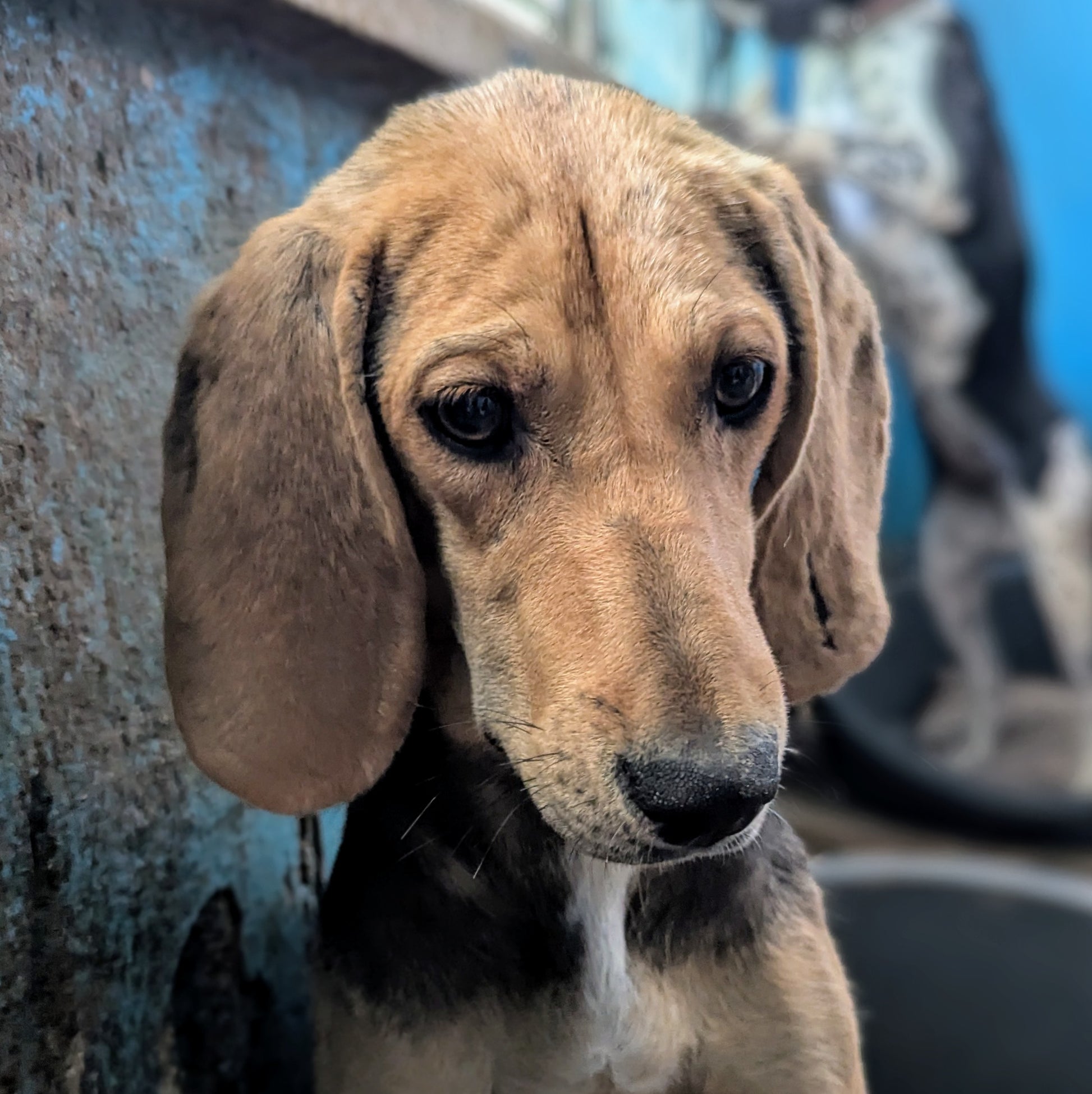 Среднего размера девочка охотничей породы. Окрас коричневый с черным и маленьким белым пятном на груди. Спокойная, дружелюбная