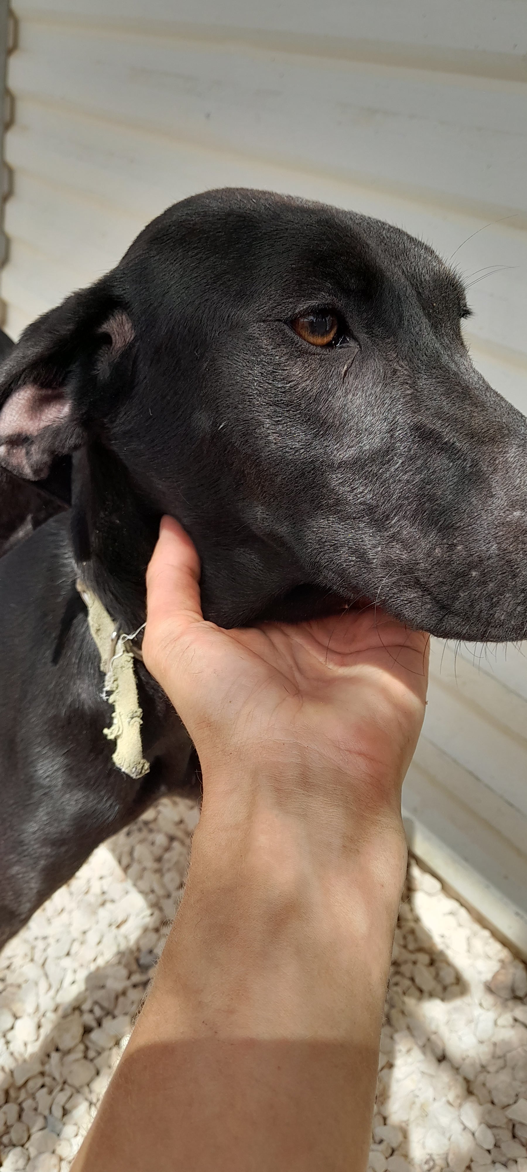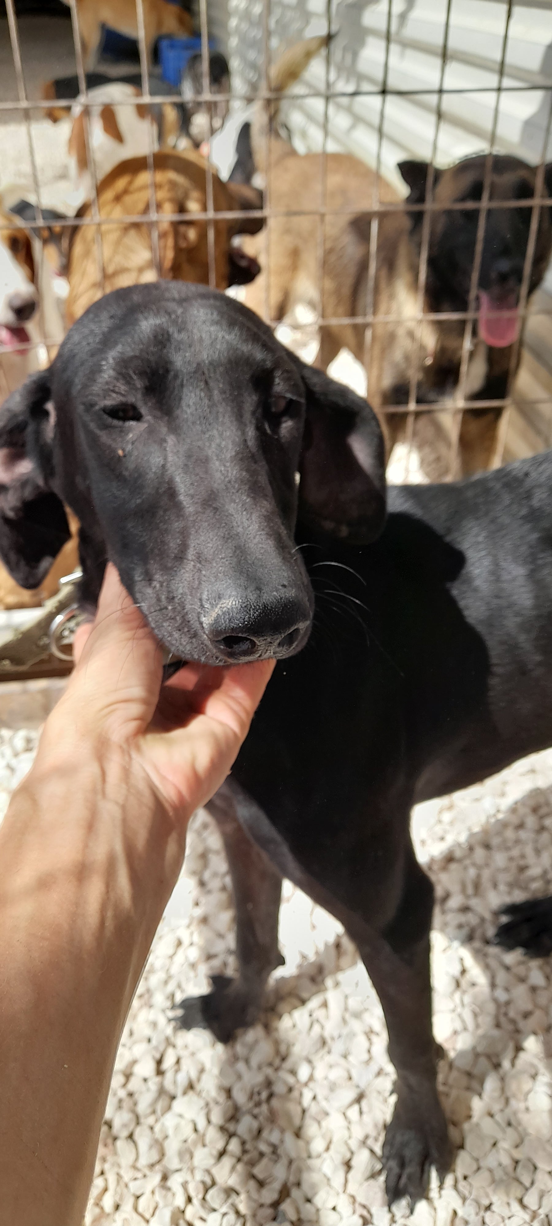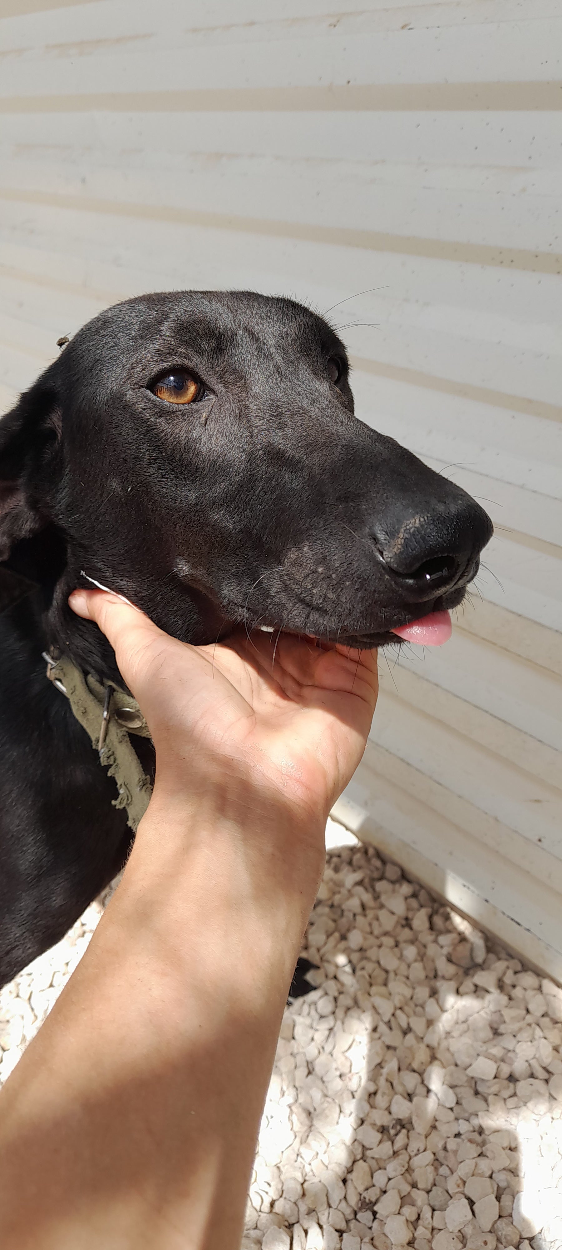 Black short hair, long legs. Green collar. Nice girl, strong on the lead but good girl. Was in puppy pen, moved to big pen 19.5.25