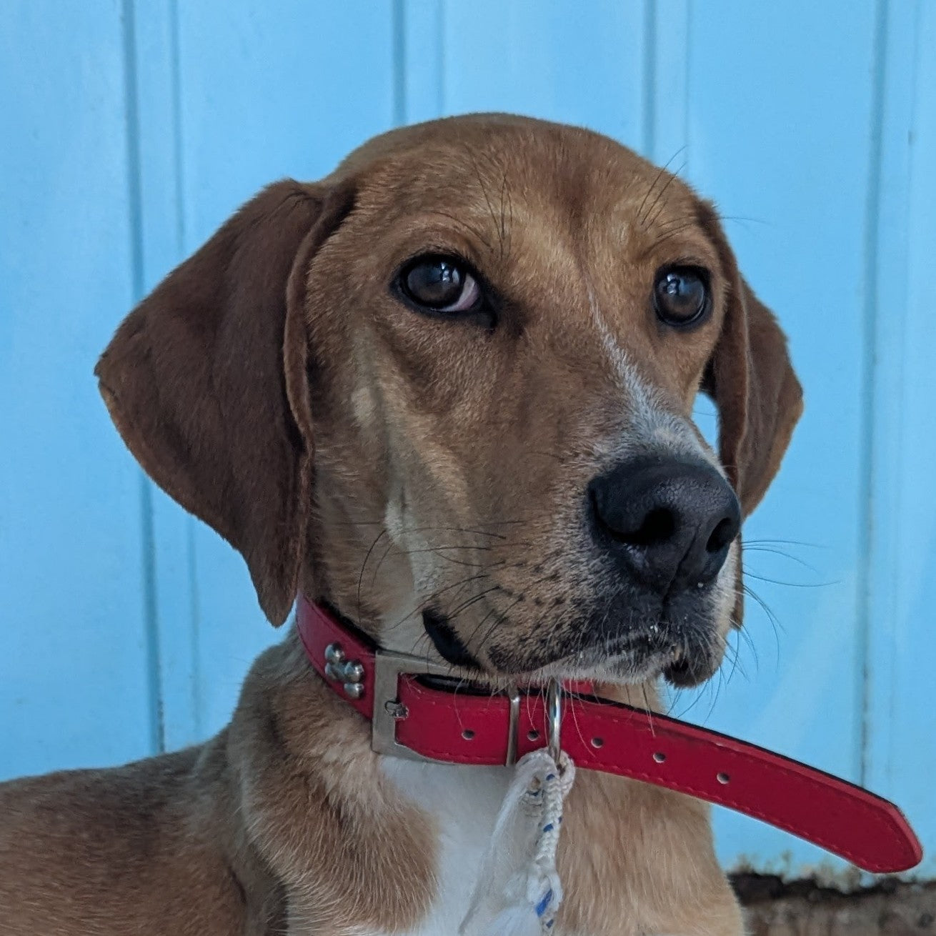 Среднего размера мальчик метис охотничьей породы рыжего окраса с белыми пятнами. Немного пуглив, но дружелюбен