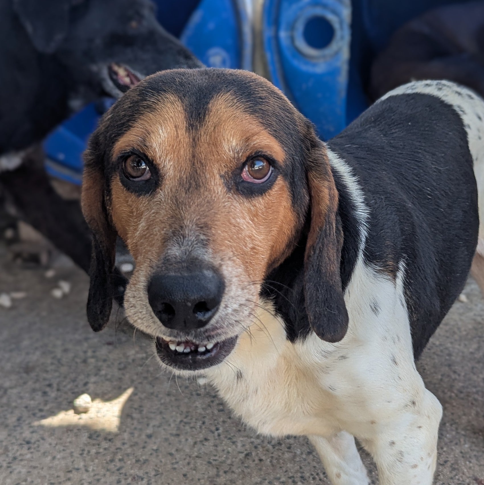 Среднего размера мальчик охотничей породы. Окрас белый с чёрным и рыжим