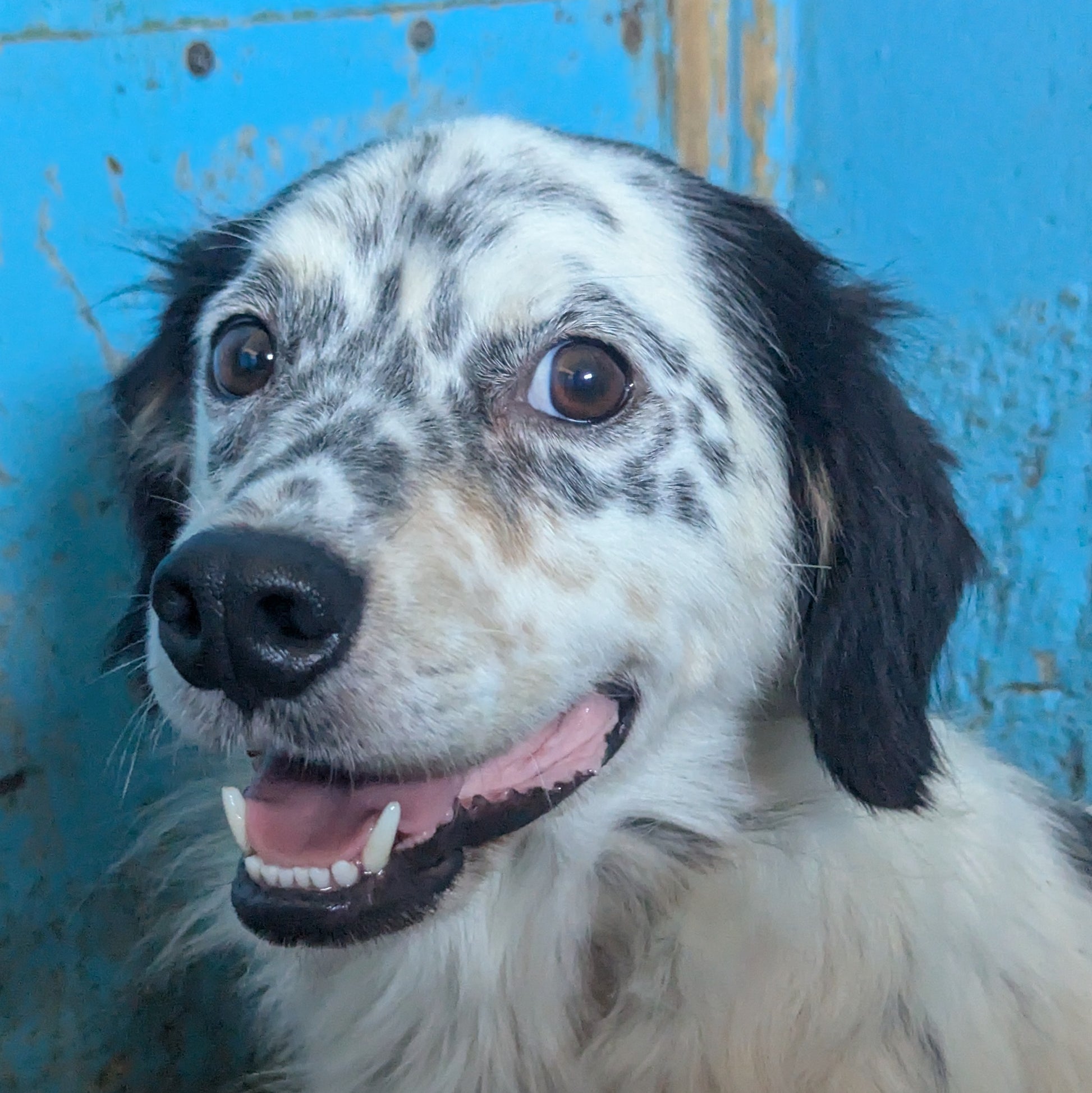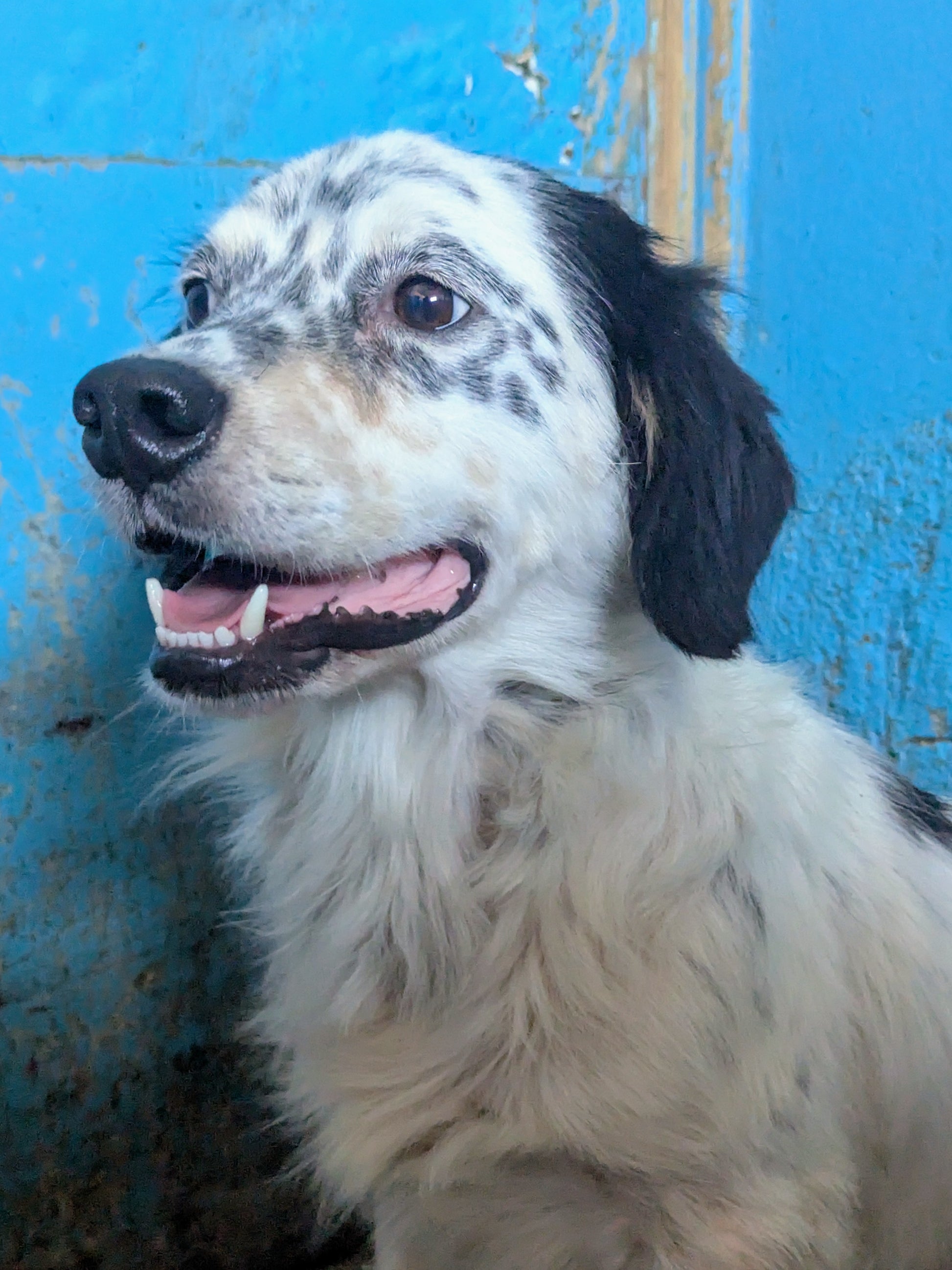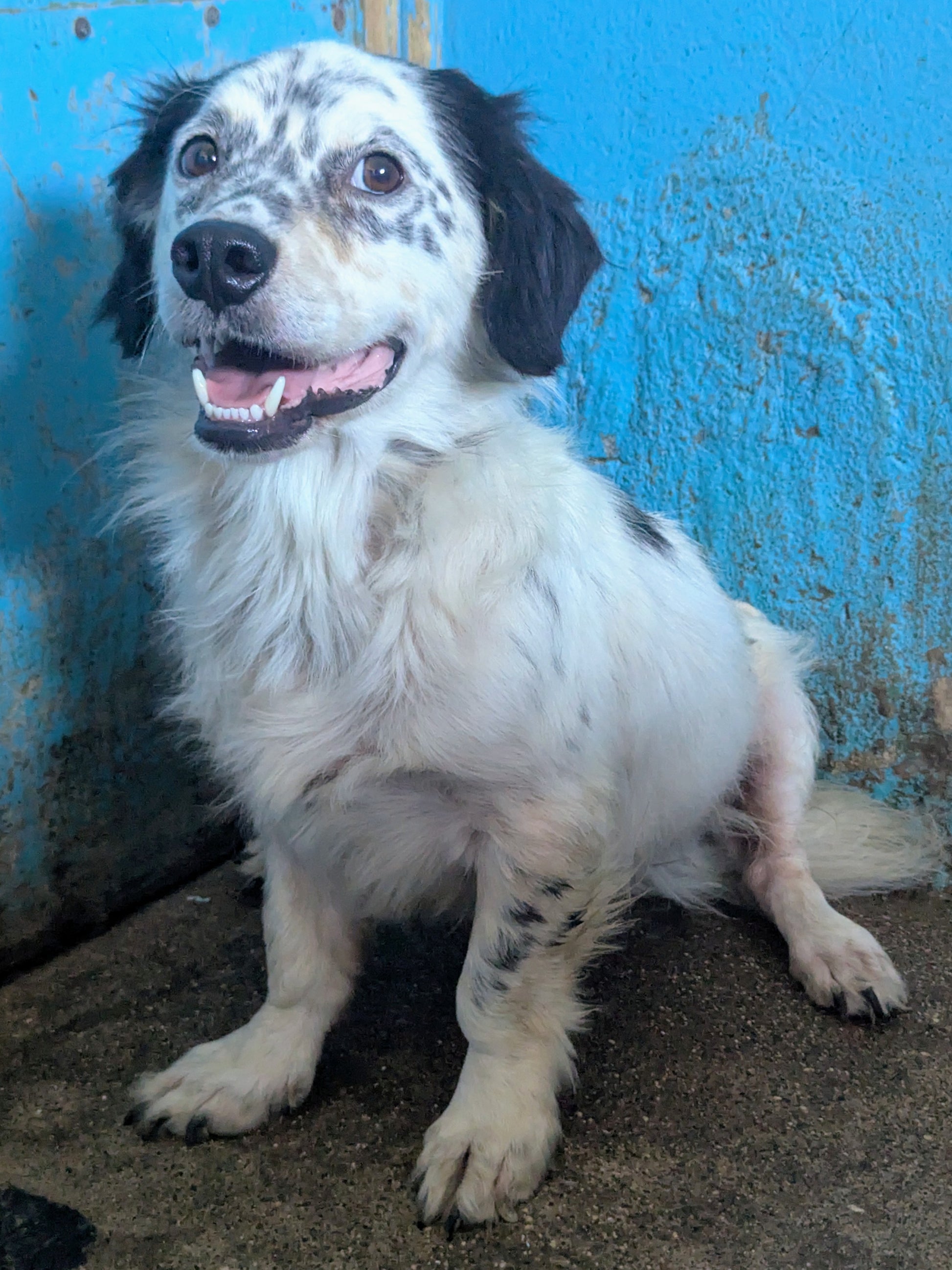 Small-sized young fluffy boy, white with black patches and spots. Friendly and walks nicely on lead.