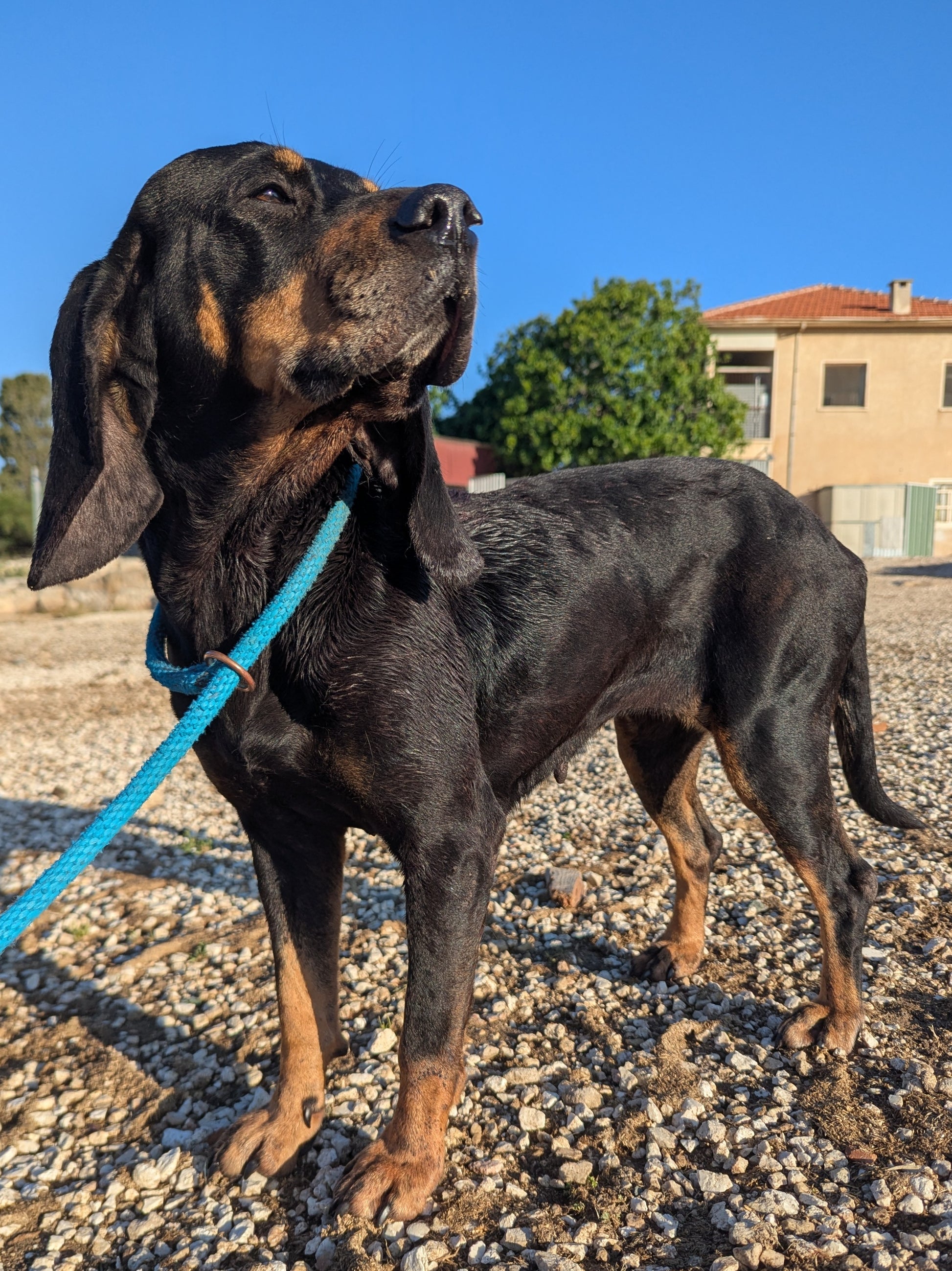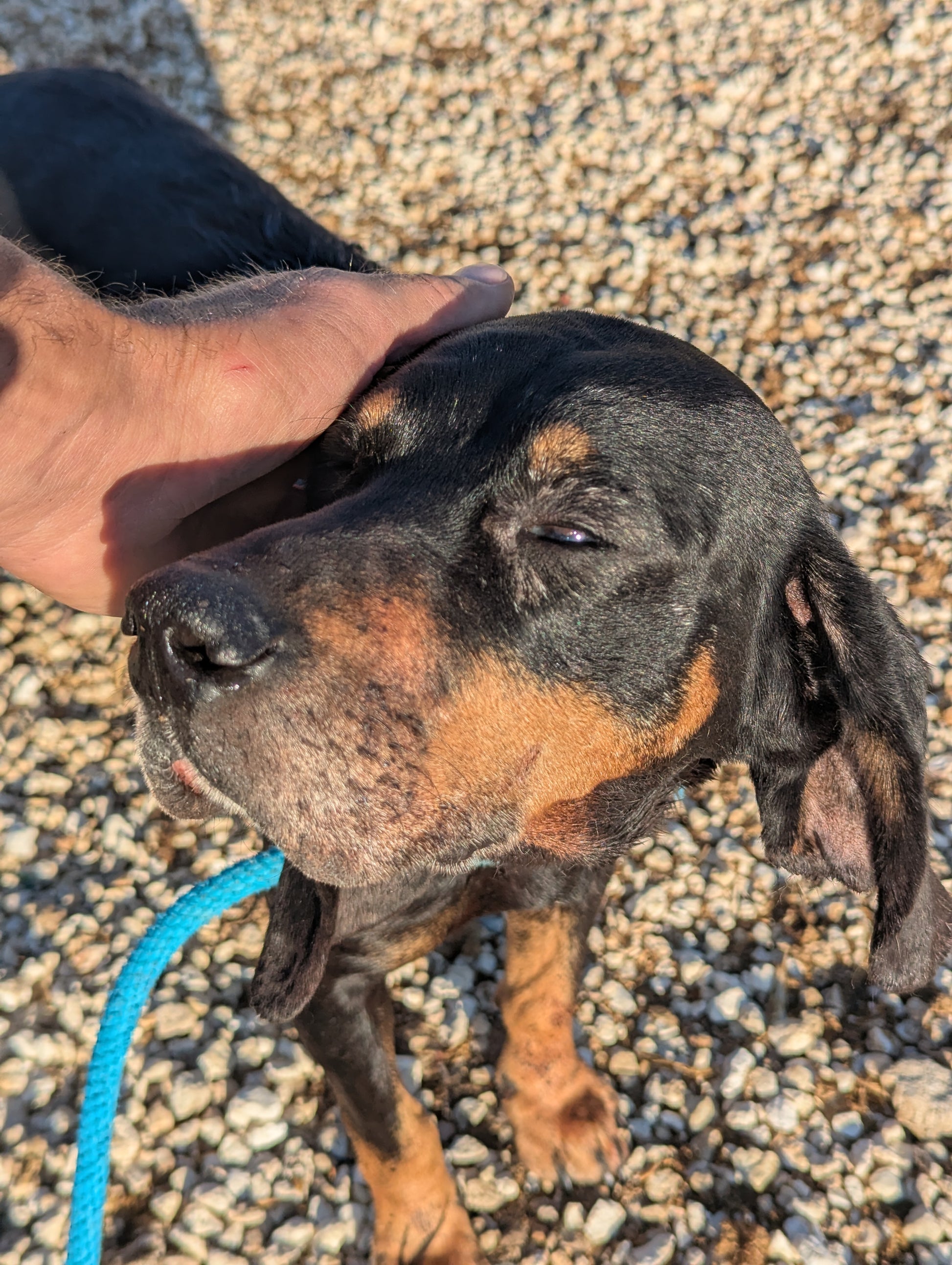 Среднего размера девочка метис охотничей породы. Окрас чёрный с рыжим. Роскошные длинные торчащие в стороны уши