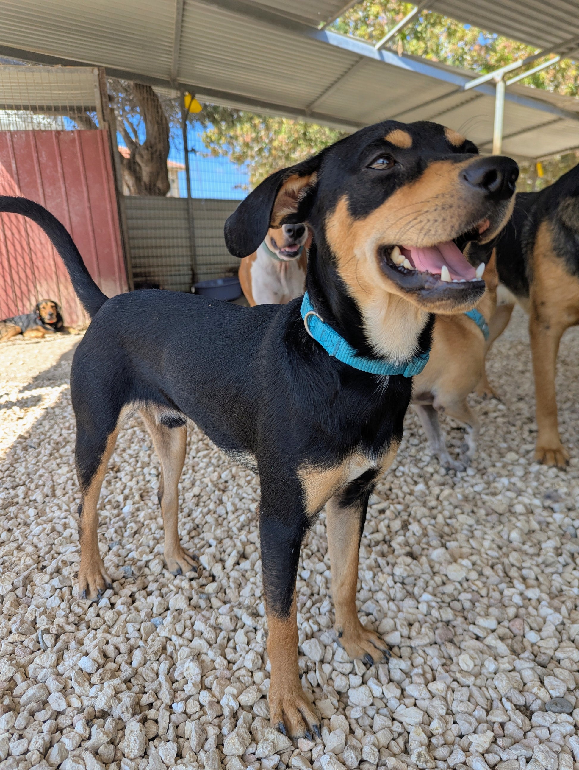 Black and tan small boy. Thaller than Alejandro, turquoise collar