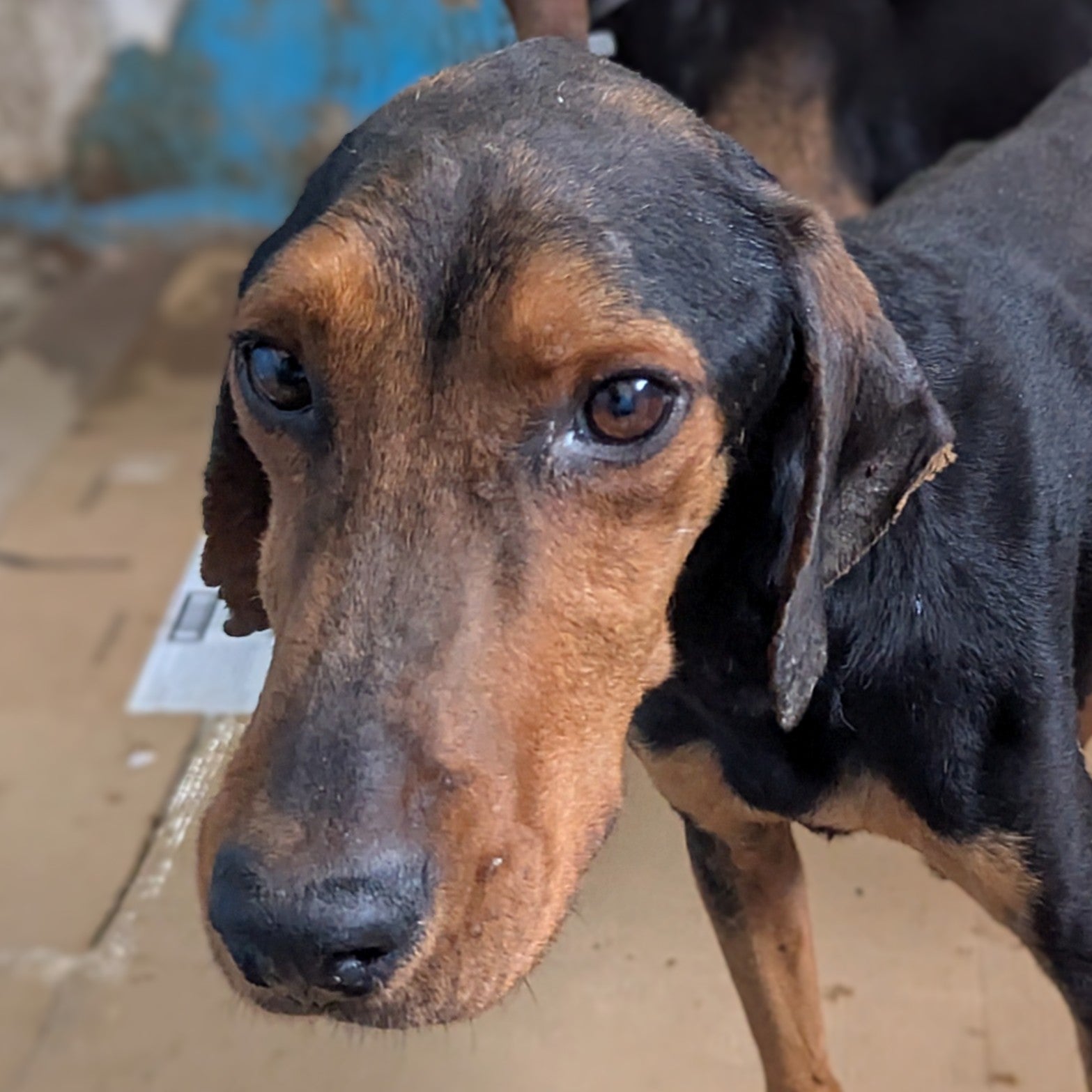 Среднего размера мальчик метис охотничей породы чёрного с рыжим окраса. Худощавый, с крупной головой. Дружелюбный, застенчивый, но любит внимание человека