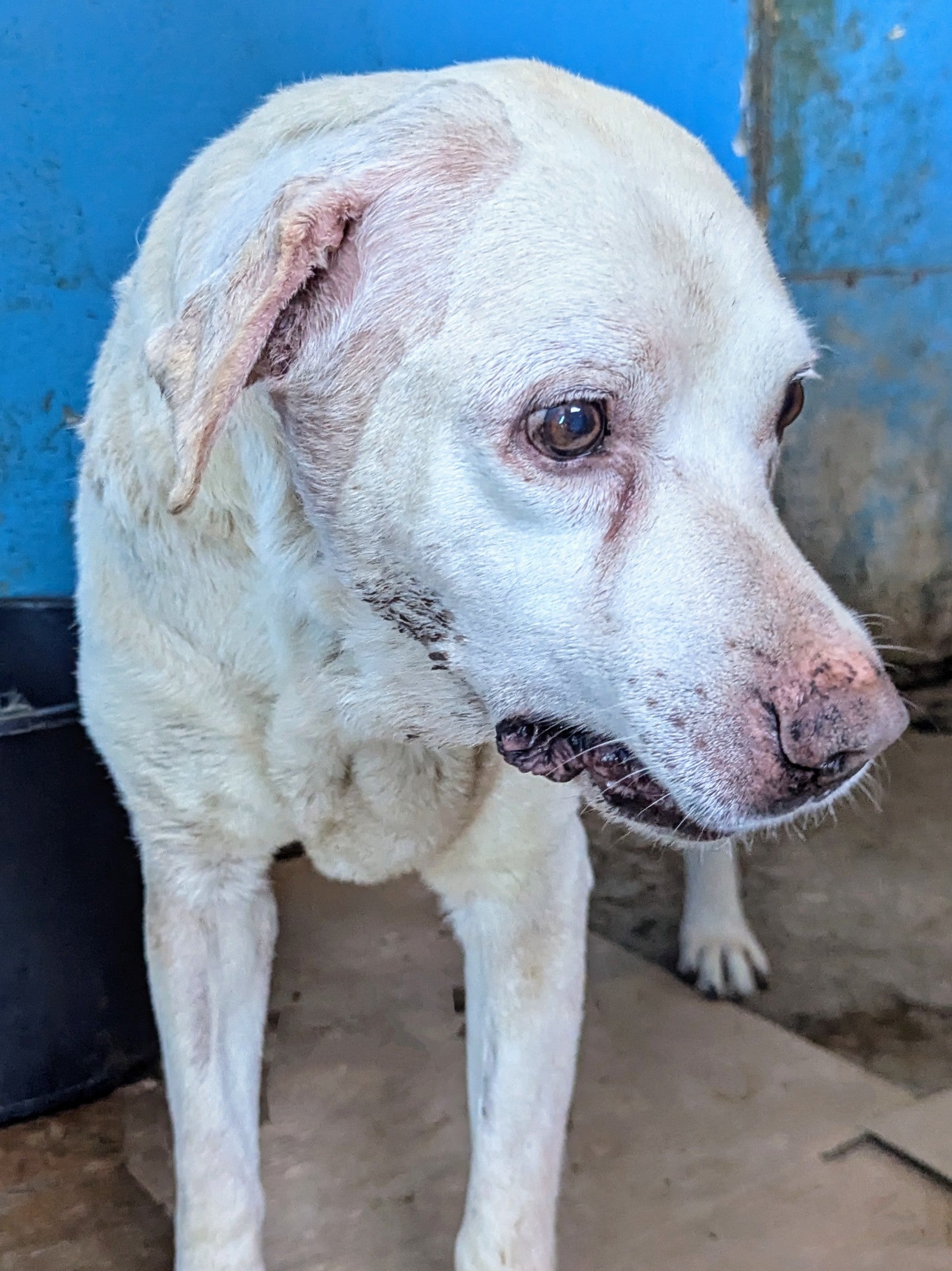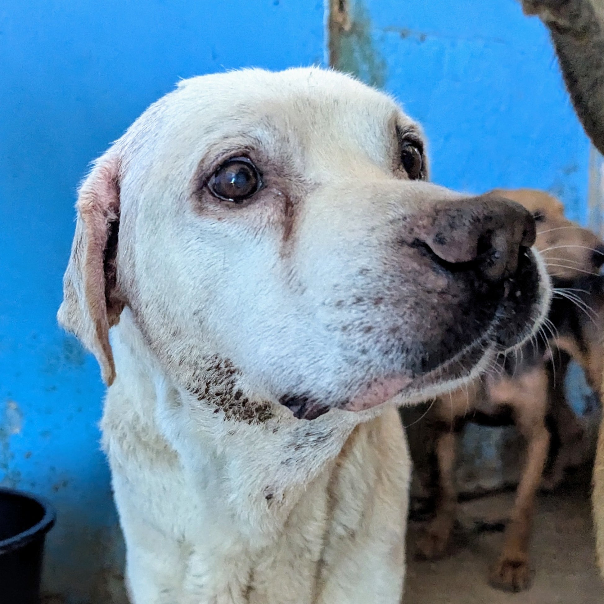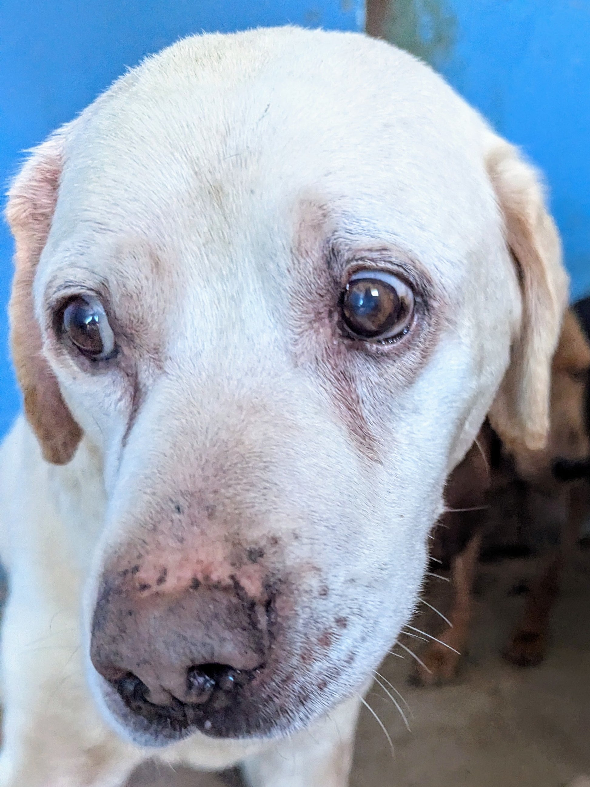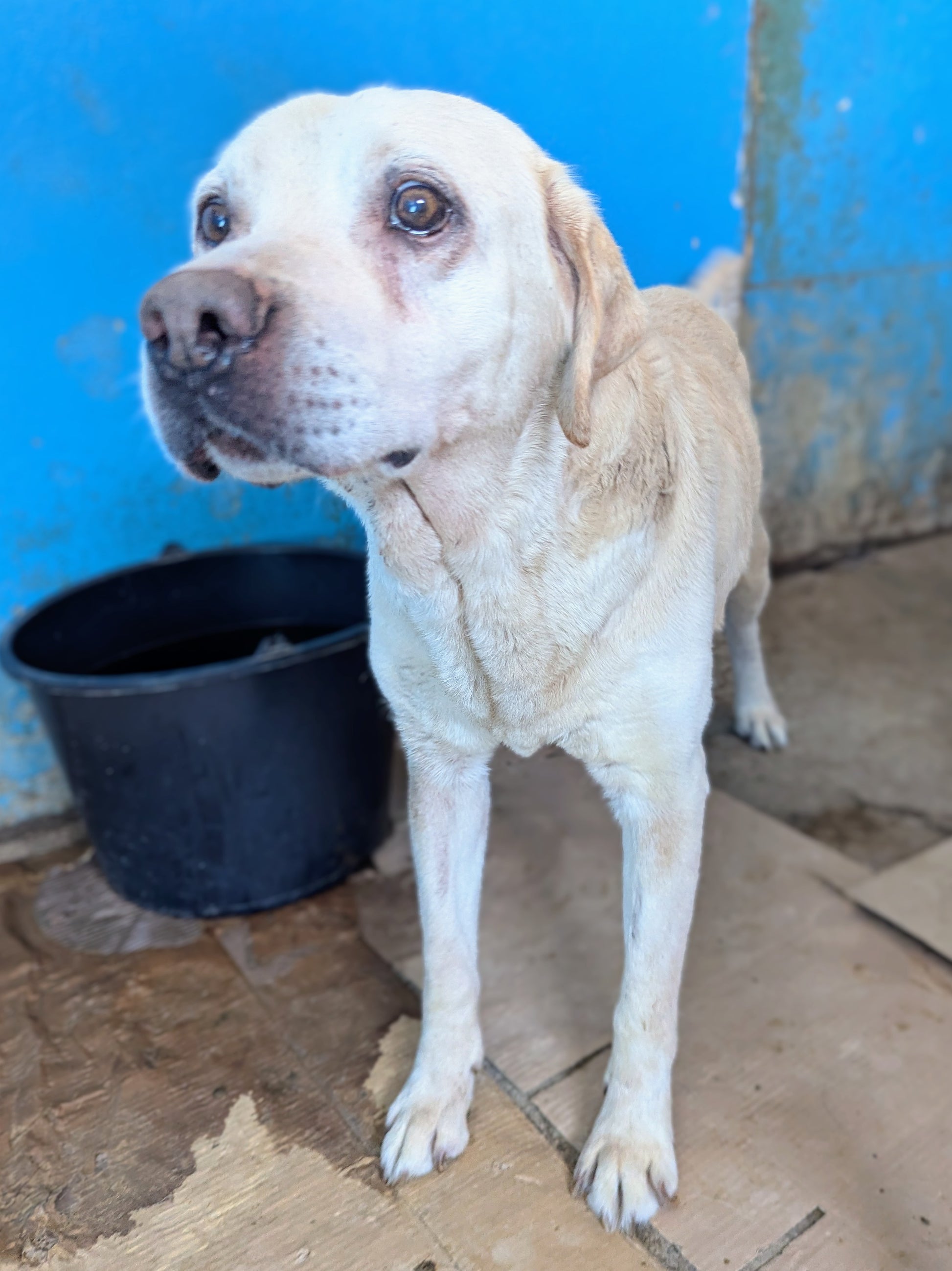 Medium-sized senior Labrador with a pale coat and deeply expressive, sad eyes. Calm, affectionate, and gentle