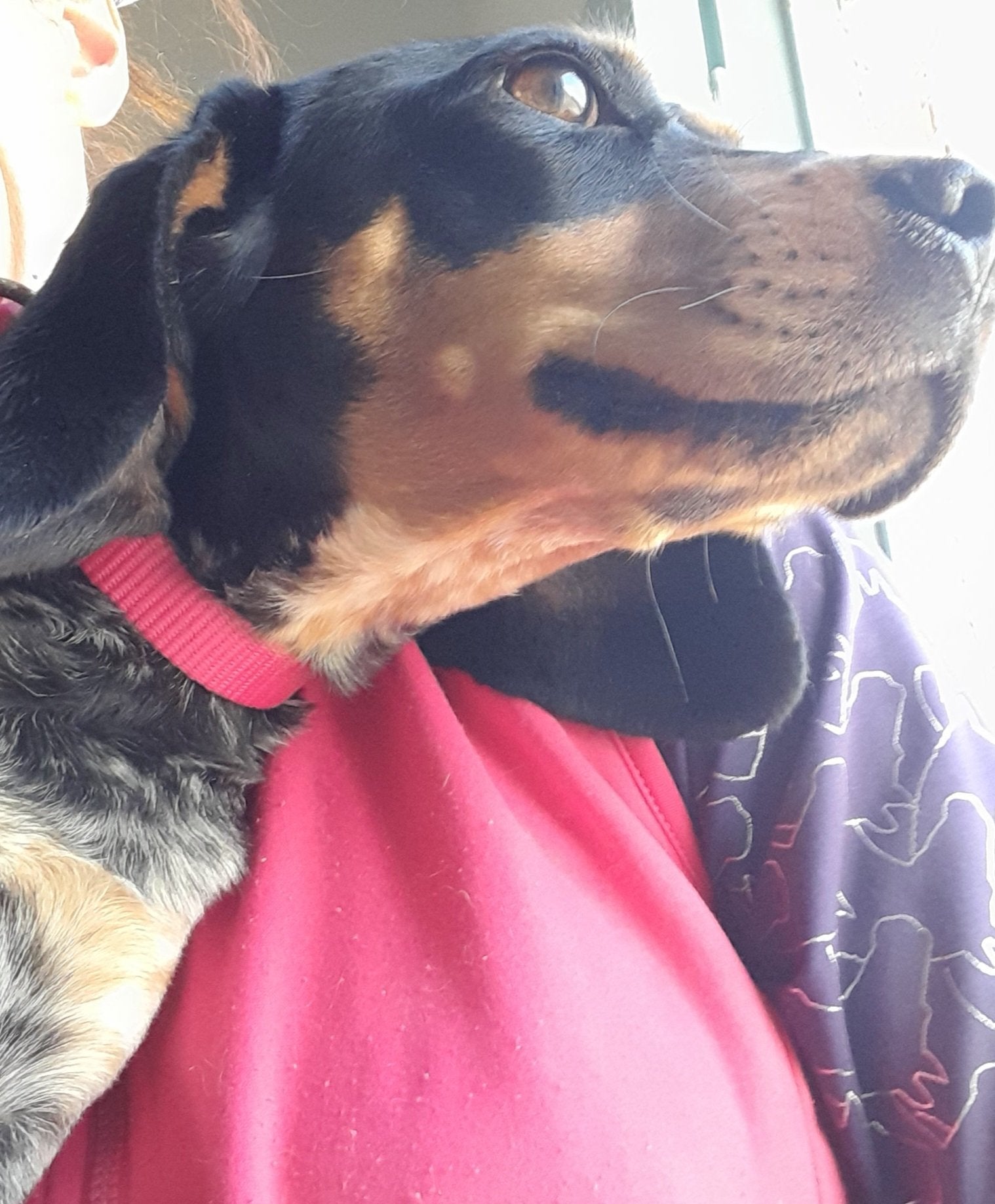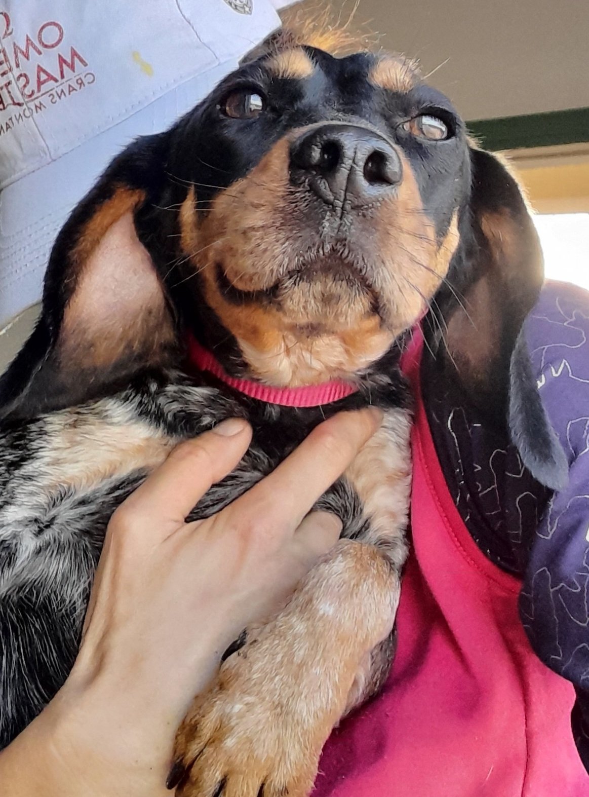 Small-sized hunter cross girl with exceptionally beautiful tri-coloured markings. Seems young. Very friendly.