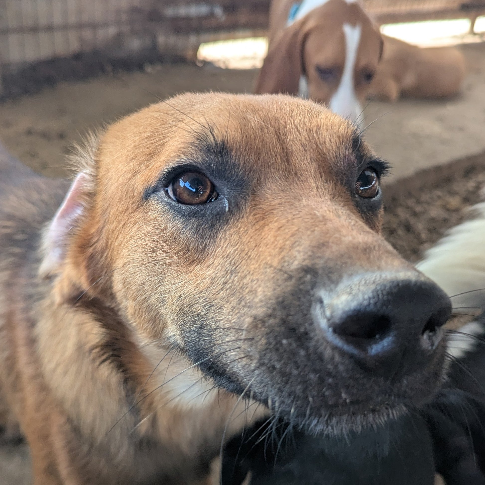 Среднего размера девочка рыжего окраса с чёрным подпалом. Очень любит внимание человека