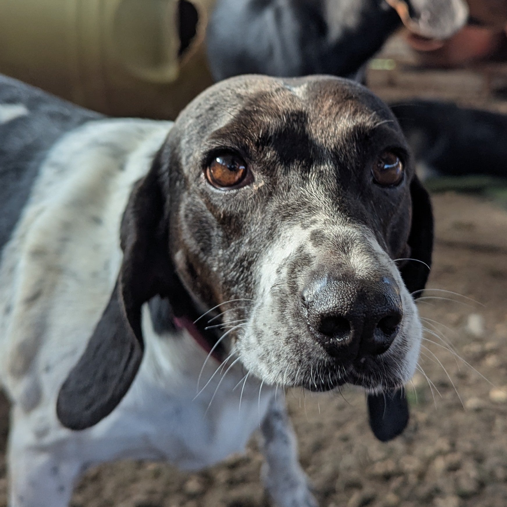 Среднего размера собака охотничей породы в возрасте. Из особенностей, задние лапы подвернуты. Ходит как бы присев на них. Дружелюбна к человеку, пуглива