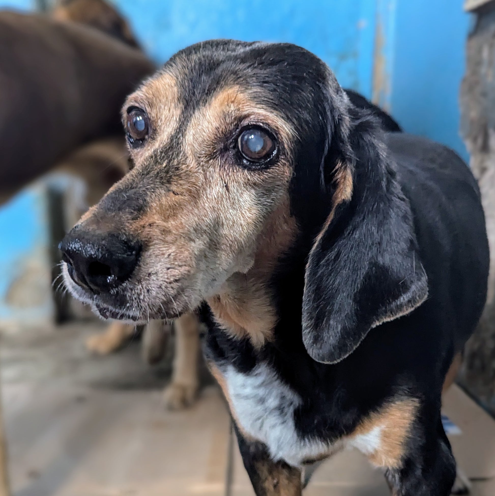 Medium-sized senior hunting mix male, black and tan with a white chest. Protective of his food during feeding. May have hearing issues